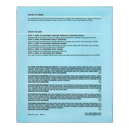 This skincare kit has all of your favorite Holy Hydration necessities in convenient travel sizes. The Hydrated Ever After Skincare Minis include a Holy Hydration! Daily Cleanser, Holy Hydration! Makeup Melting Cleansing Balm, Hydrating Booster Drops, Holy Hydration! Face Cream and Eye Cream