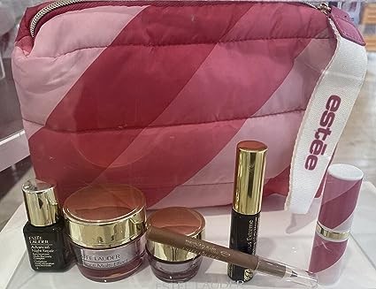 7Pc Estee Lauder Makeup/ Skincare Travel Set - Resilience Multi-Effect. Lift Your Look Choice Includes: Resilience Multi-Effect Face and Neck Creme SPF 15, 15mL, Resilience Multi-Effect Eye Creme, 5mL, Advanced Night Repair Synchronized Multi-Recovery Complex Serum, 7mL, Pure Color Envy Lipstick in Irresistible (Full-Size), 3.5g, Double Wear Lip Pencil in Nude, 0.8g/.02oz, Sumptuous Extreme Mascara in Extreme Black, 2.8mL, Exclusive Puffer Pink Pouch. New. Sealed.