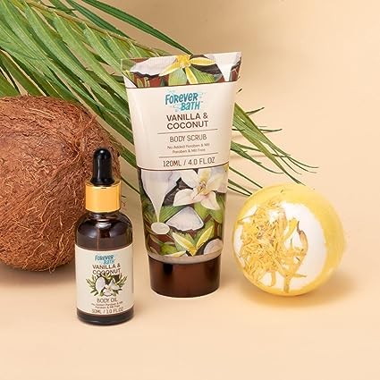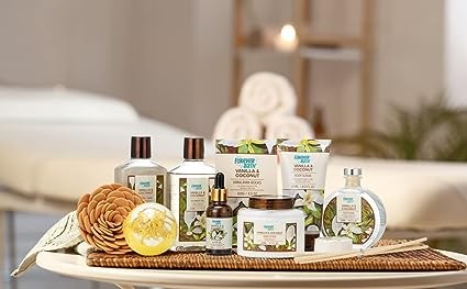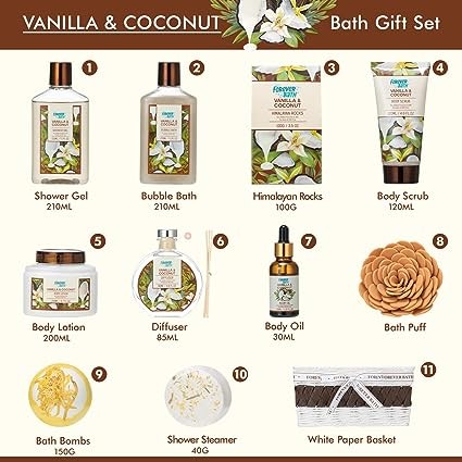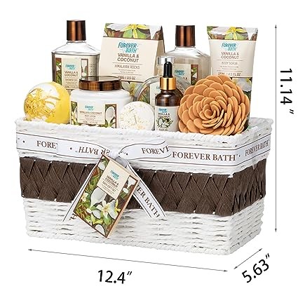Forever Bath Spa Gift Basket – Bath and Body Gift Sets for Women W/Coconut & Vanilla Fragrance, 11 Pcs Shower Gift - Shower Gel, Bubble Bath, Body Lotion, Scrub & Oil, Shower Steamer, Bath Bomb & More